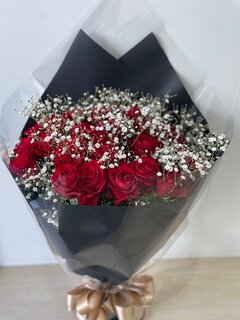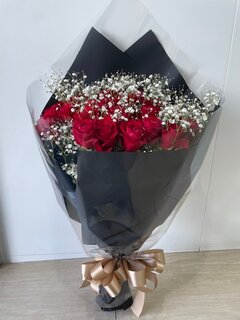 オプションでかすみ草、ブラックラッピング、ゴールドリボン、しっかり保水、花束固定段ボールを追加いただきました!